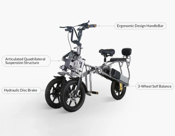 Three wheels make the e-bike stable, and extra seats enable you to take small passengers along for a ride. The ability to fold the bike up and store it away is a unique feature.